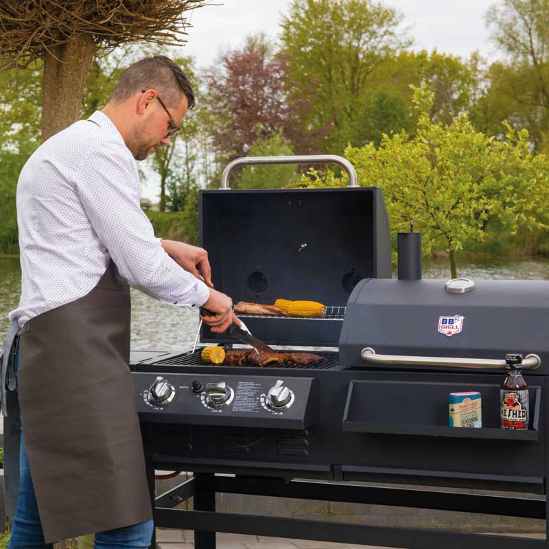 BBGRILL GRAND CANYON uses a standard gas cylinder. The grill has a special heat storage cabinet/shelf, which will allow your grills and food to be kept warm using the heat of the charcoal grill.